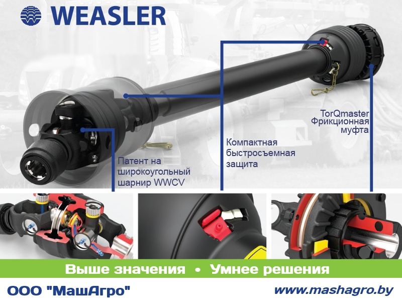Предприятие "МашАгро" входит в мировую сеть дистрибьюторов Weasler и представляет её интересы на территории Российской Федерации, Республики Беларусь, в Украине, Казахстане. Weasler поставляет качественные продукты всем крупным производителям во всем мире. Годы опыта и приверженность научным исследованиям позволили Weasler зарекомендовать себя как производителя лучшей защиты для карданных валов. Weasler производит широкую линейку сельскохозяйственных валов и комплектующих разных стилей.